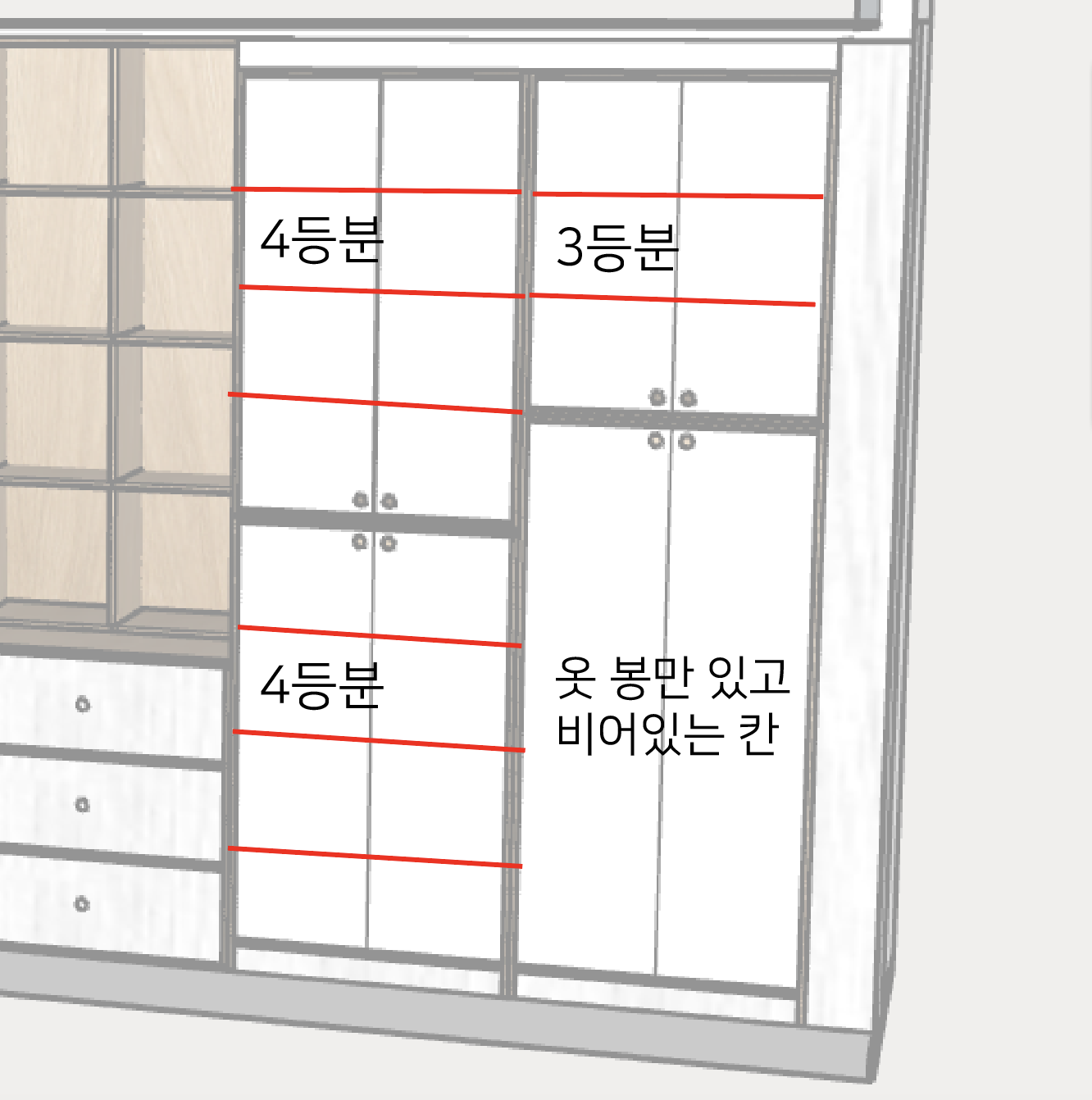실측미팅 이후에 3D로 디자인을 보내주시고 색상이나 옷장 안에 구성도 수정해주시고 마감 부분도 수정을 잘해주셨답니다.