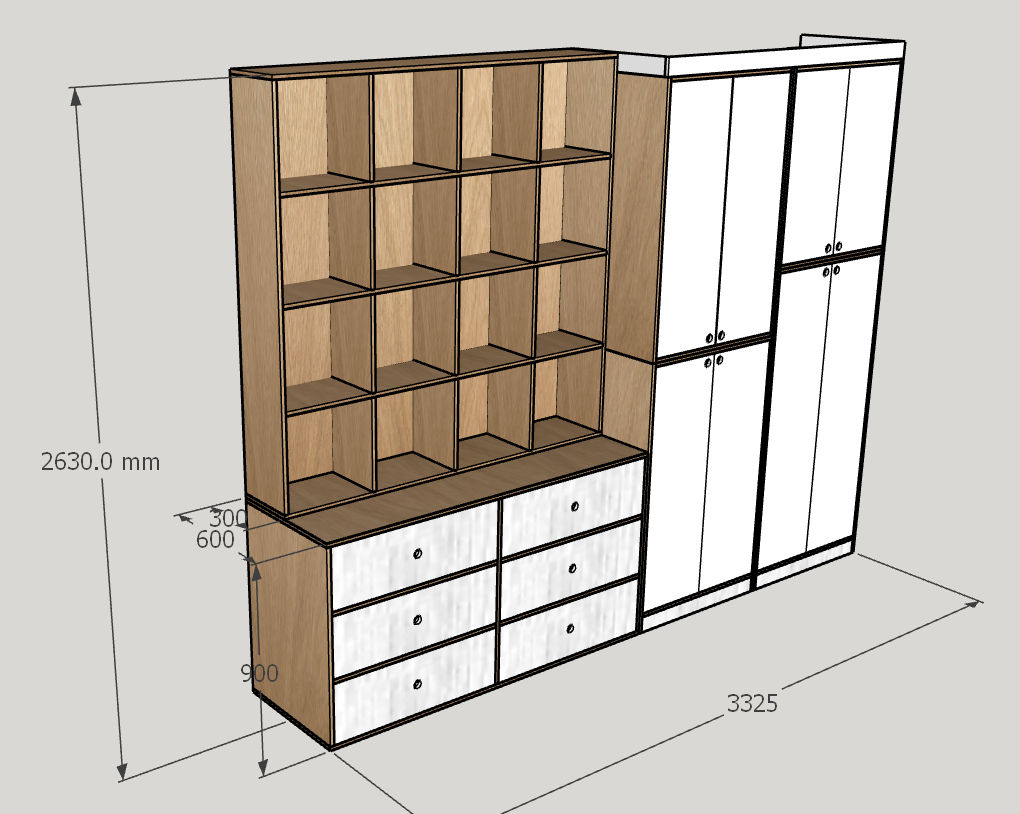 처음 계획은 책장으로만 벽 전체를 하고 싶었는데 집에 수납이 부족해서 수납장과 서랍장도 추가했어요.